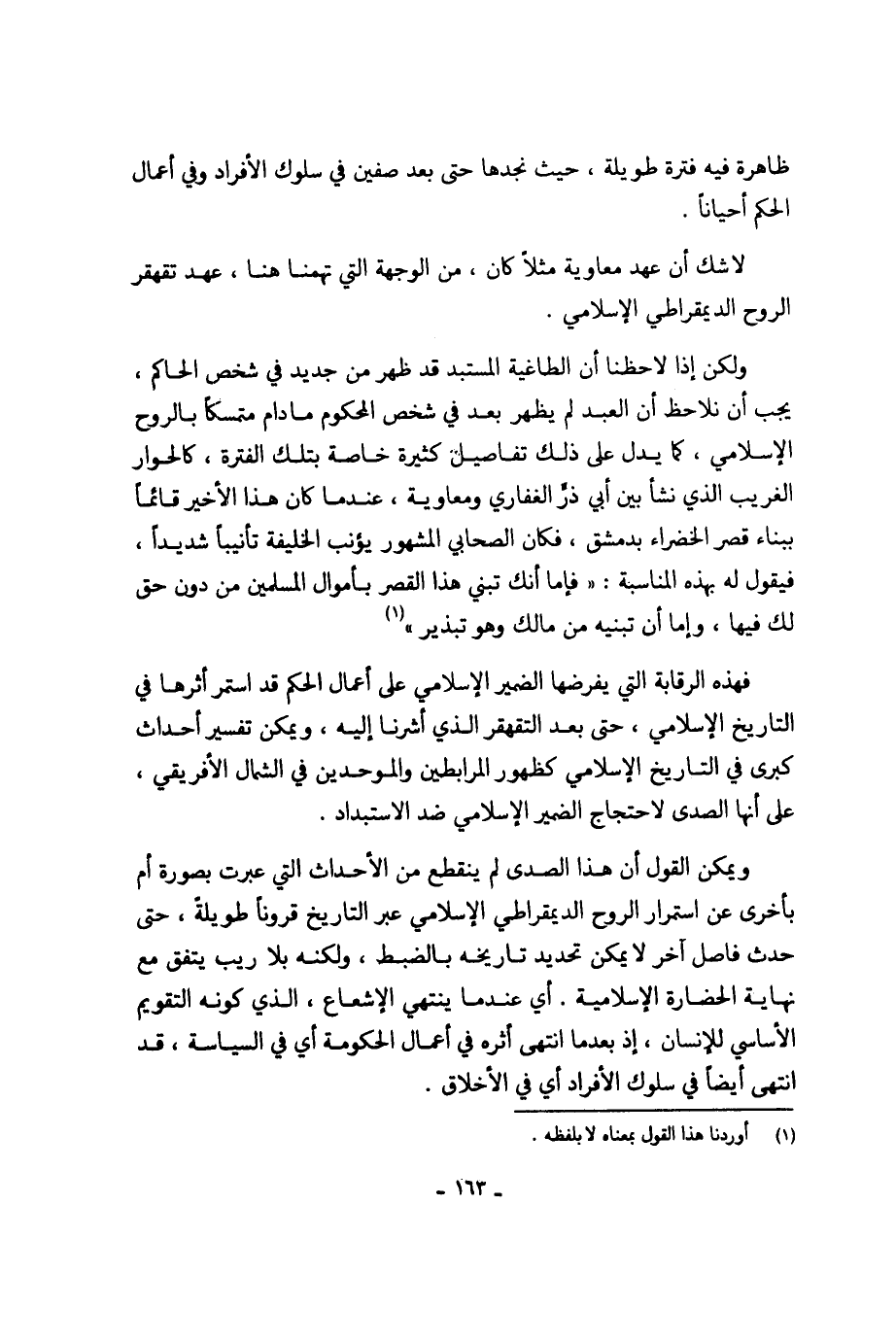 لا شك أن عهد معاوية مثلاً كان، من الوجهة التي تهمنا هنا، عهد تقهقر الروح الديمقراطي الإسلامي.