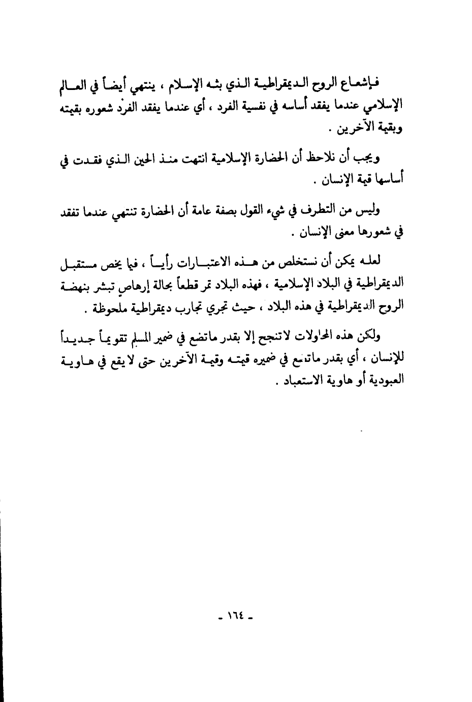 فإشعاع الروح الديمقراطية الذي بثه الإسلام، ينتهي أيضاً في العالم الإسلامي عندما يفقد أساسه في نفسية الفرد، أي عندما يفقد الفرد شعوره بقيمته وبقيمة الآخرين.