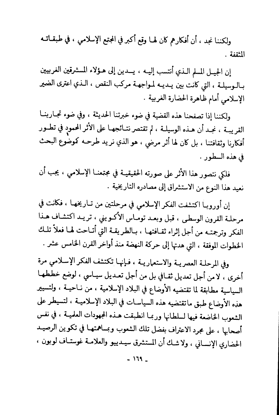 إن الجيل المسلم الذي أنتسب إليه، يدين إلى هؤلاء المستشرقين الغربيين بالوسيلة، التي كانت بين يديه لمواجهة مركب النقص، الذي اعترى الضمير الإسلامي أمام ظاهرة الحضارة الغربية.