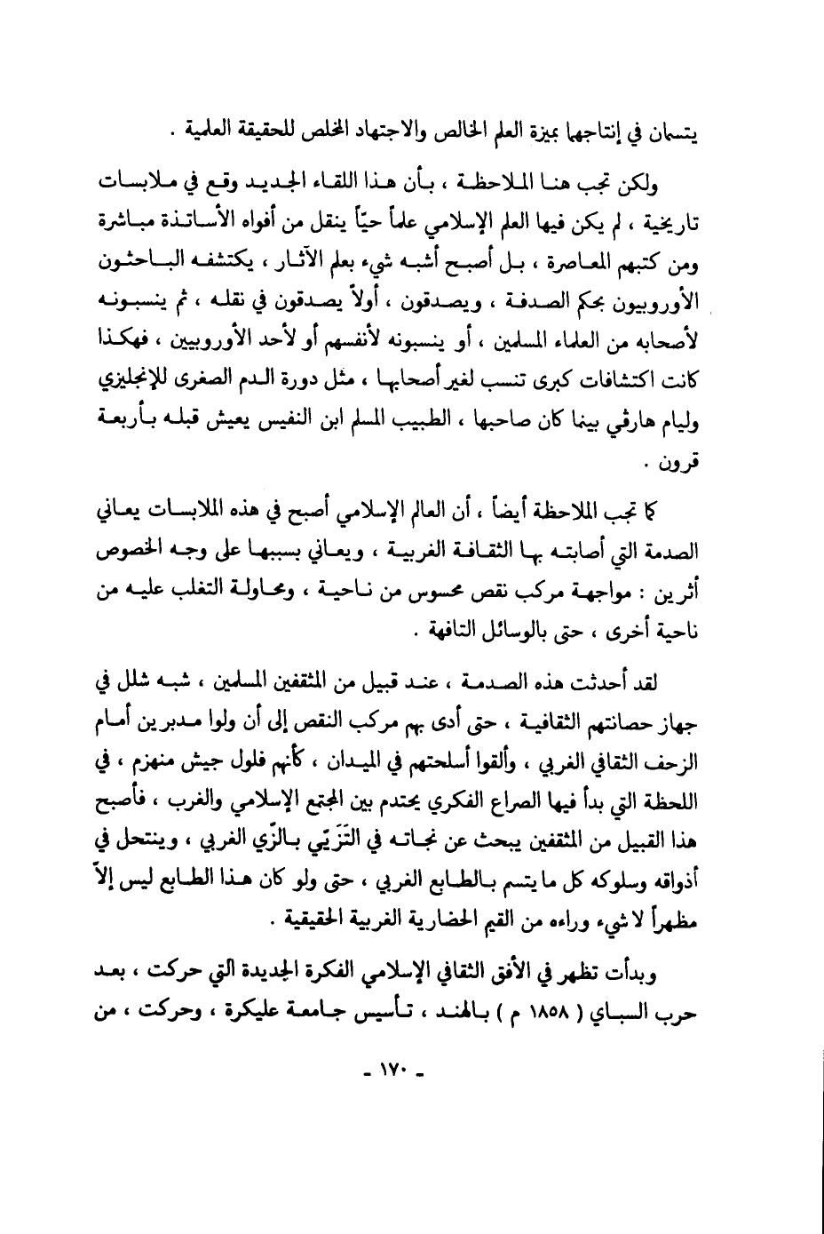 كما تجب الملاحظة أيضاً، أن العالم الإسلامي أصبح في هذه الملابسات يعاني الصدمة التي أصابته بها الثقافة الغربية، ويعاني بسببها على وجه الخصوص أثرين: مواجهة مركب نقص محسوس من ناحية، ومحاولة التغلب عليه من ناحية أخرى، حتى بالوسائل التافهة.