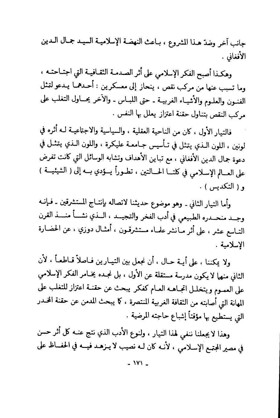 ولا يمكننا، على أية حال، أن نجعل بين التيارين فاصلاً قاطعاً، لأن الثاني منهما لا يكون مدرسة مستقلة عن الأول، بل نجده يخامر الفكر الإسلامي على العموم ويتخلل اتجاهه العام كفكر يبحث عن حقنة اعتزاز للتغلب على المهانة التي أصابته من الثقافة الغربية المنتصرة، كما يبحث المدمن عن حقنة المخدر التي يستطيع بها مؤقتاً إشباع حاجته المرضية.