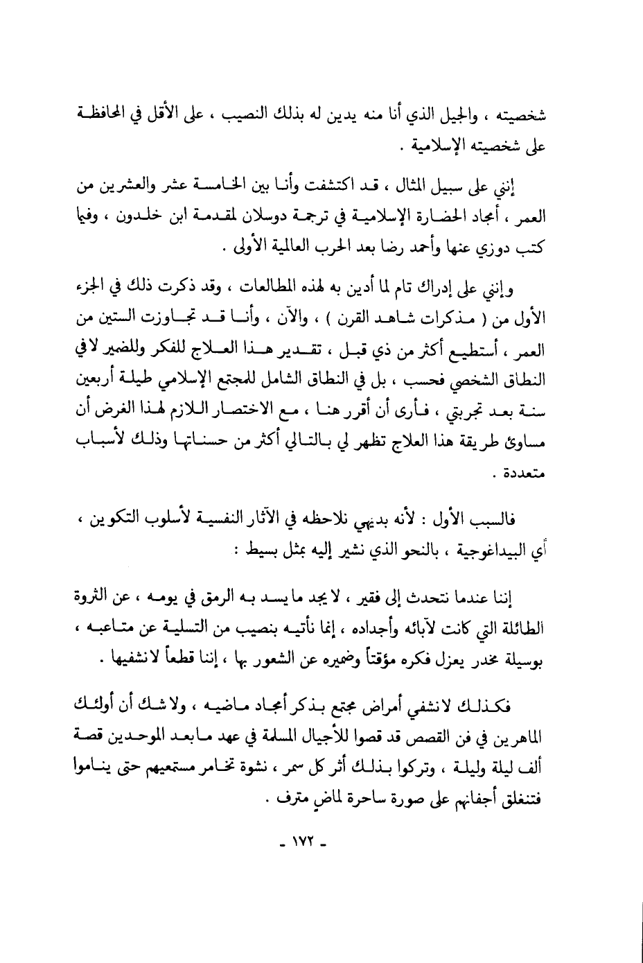 وإنني على إدراك تام لما أدين به لهذه المطالعات، وقد ذكرت ذلك في الجزء الأول من (مذكرات شاهد القرن)، والآن، وأنا قد تجاوزت الستين من العمر، أستطيع أكثر من ذي قبل، تقدير هذا العلاج للفكر وللضمير لا في النطاق الشخصي فحسب، بل في النطاق الشامل للمجتمع الإسلامي طيلة أربعين سنة بعد تجربتي، فأرى أن أقرر هنا، مع الاختصار اللازم لهذا الغرض أن مساوئ طريقة هذا العلاج تظهر لي بالتالي أكثر من حسناتها وذلك لأسباب متعددة.
