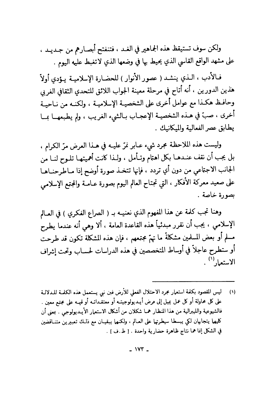 فالأدب، الذي ينشد (عصور الأنوار) للحضارة الإسلامية يؤدي أولاً هذين الدورين، أنه أتاح في مرحلة معينة الجواب اللائق للتحدي الثقافي الغربي وحافظ هكذا مع عوامل أخرى على الشخصية الإسلامية، ولكنه من ناحية أخرى، صبّ في هذه الشخصية الإعجاب بالشيء الغريب، ولم يطبعها بما يطابق عصر الفعالية والميكانيك.
