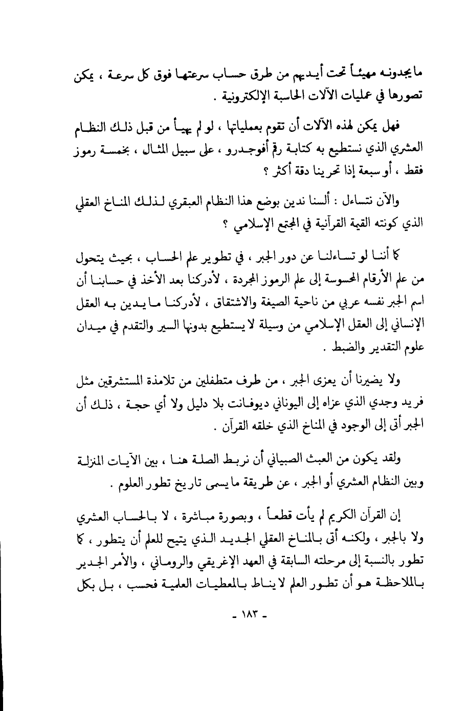 ولقد يكون من العبث الصبياني أن نربط الصلة هنا، بين الآيات المنزلة وبين النظام العشري أو الجبر، عن طريقة ما يسمى تاريخ تطور العلوم.