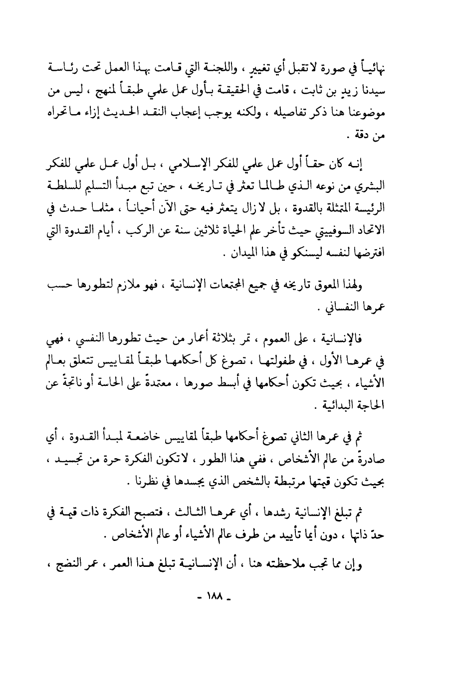 نهائياً في صورة لا تقبل أي تغييرٍ، واللجنة التي قامت بهذا العمل تحت رئاسة سيدنا زيدٍ بن ثابت، قامت في الحقيقة بأول عمل علمي طبقاً لمنهج، ليس من موضوعنا هنا ذكر تفاصيله، ولكنه يوجب إعجاب النقد الحديث إزاء ما تحراه من دقة.