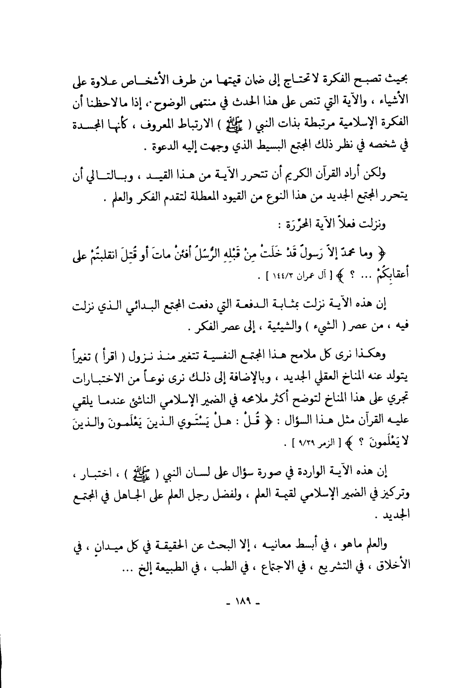وهكذا نرى كل ملامح هذا المجتمع النفسية تتغير منذ نزول (اقرأ) تغيراً يتولد عنه المناخ العقلي الجديد، وبالإضافة إلى ذلك نرى نوعاً من الاختبارات تجري على هذا المناخ لتوضح أكثر ملامحه في الضمير الإسلامي الناشئ عندما يلقي عليه القرآن مثل هذا السؤال: {قُلْ: هَلْ يَسْتَوِي الَّذِينَ يَعْلَمُونَ وَالَّذِينَ لَا يَعْلَمُونَ؟} [الزمر 39/ 9].