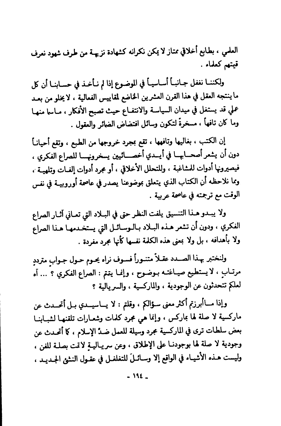 ولنختبر بهذا الصدد عقلاً متنوراً فسوف نراه يحوم حول جوابٍ مترددٍ مرتابٍ، لا يستطيع صياغته بوضوح، وإنما يتمتم: الصراع الفكري؟ ... آه لعلكم تتحدثون عن الوجودية، والماركسية، والسريالية؟