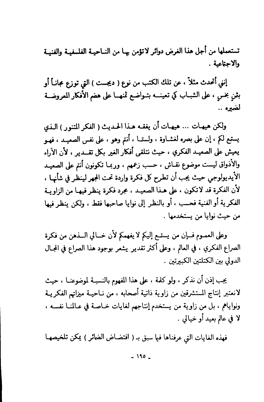 وعلى العموم فإن من يستمع إليكم لا يفهمكم لأن خالي الذهن من فكرة الصراع الفكري، في العالم، وعلى أكثر تقدير يشعر بوجود هذا الصراع في المجال الدولي بين الكتلتين الكبيرتين.