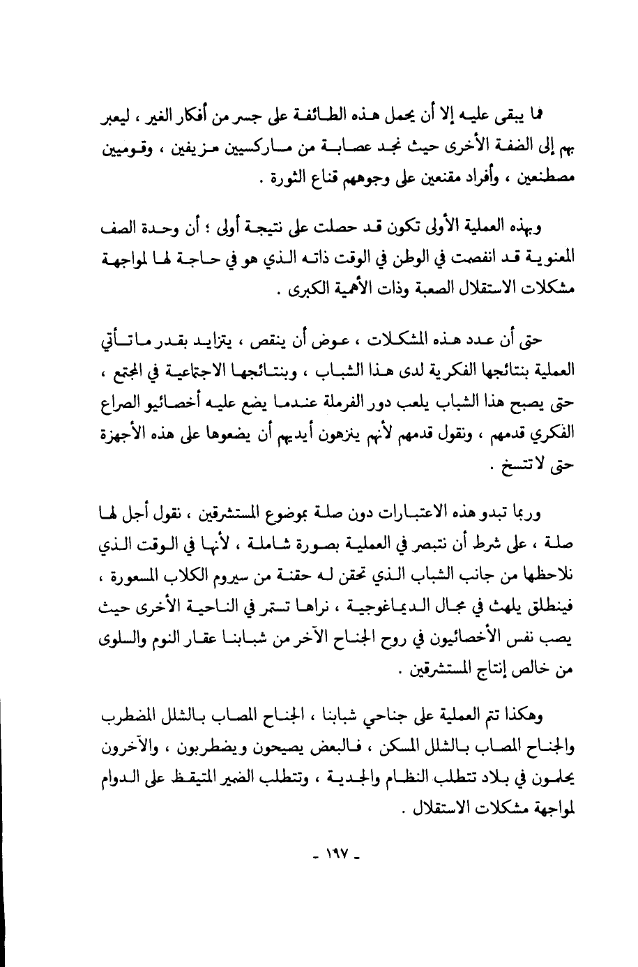 وهكذا تتم العملية على جناحي شبابنا، الجناح المصاب بالشلل المضطرب والجناح المصاب بالشلل المسكن، فالبعض يصيحون ويضطربون، والآخرون يحلمون في بلاد تتطلب النظام والجدية، وتتطلب الضمير المتيقظ على الدوام لمواجهة مشكلات الاستقلال.