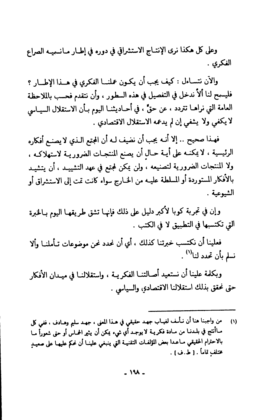 والآن نتساءل: كيف يجب أن يكون عملنا الفكري في هذا الإطار؟ فليسمح لنا ألاَّ ندخل في التفصيل في هذه السطور، وأن نتقدم فحسب بالملاحظة العامة التي نراها تتردد، عن حقٍّ، في أحاديثنا اليوم بأن الاستقلال السياسي لا يكفي ولا يشفي إن لم يدعمه الاستقلال الاقتصادي.