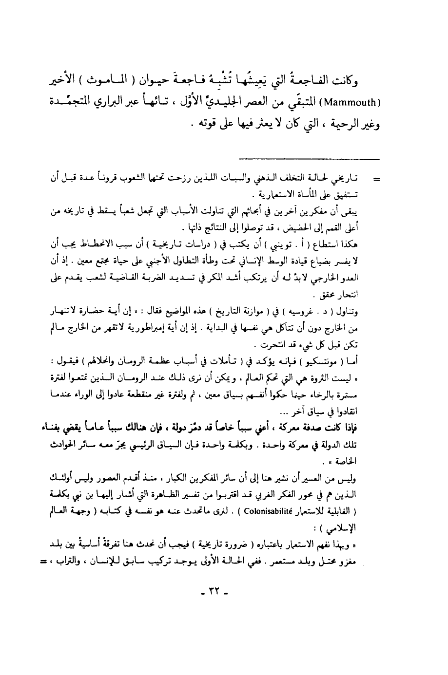 = تاريخي لحالة التخلف الذهني والسبات اللذين رزحت تحتها الشعوب قروناً عدة قبل أن تستفيق على المأساة الاستعمارية.