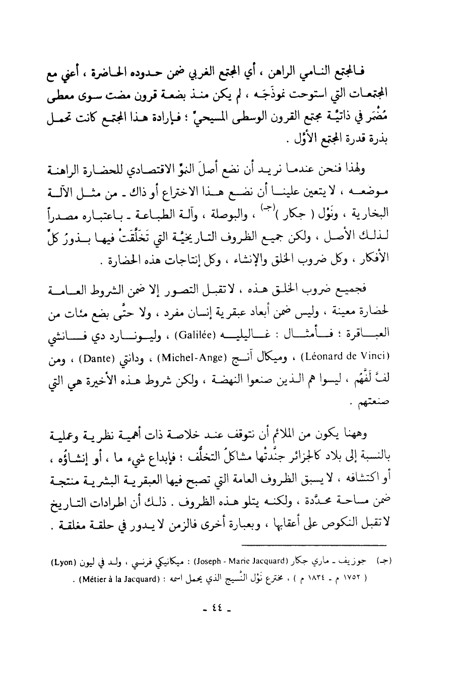 ولهذا فنحن عندى ما نريد أن نضع أصلَ النموِّ الاقتصادي للحضارة الراهنة موضعه، لا يتعين علينا أن نضع هذا الاختراع أو ذاك- من مثل الآلة البخارية، ونَوْل (جكار) (جـ)، والبوصلة، وآلة الطباعة- باعتباره مصدراً لذلك الأصل، ولكن جميع الظروف التاريخيَّة التي تَخَلَّقَتْ فيها بذورُ كلِّ الأفكار، وكل ضروب الخلق والإنشاء، وكل إنتاجات هذه الحضارة.