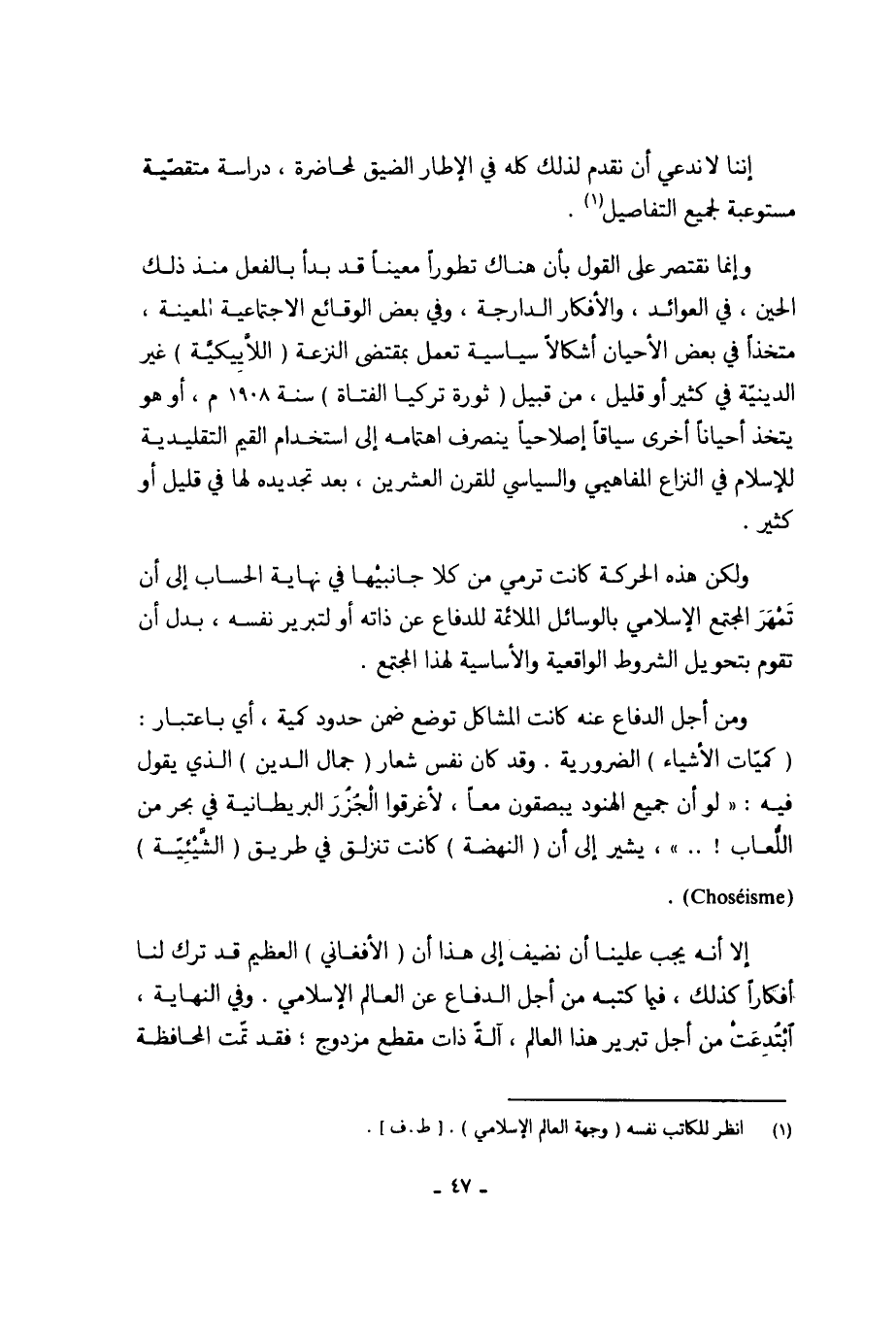 وإنما نقتصر على القول بأن هناك تطوراً معيناً قد بدأ بالفعل منذ ذلك الحين، في العوائد، والأفكار الدارجة، وفي بعض الوقائع الاجتماعية المعينة، متخذاً في بعض الأحيان أشكالاً سياسية تعمل بمقتضى النزعة (اللاَّيِيكيَّة) غير الدينيّة في كثير أو قليل، من قبيل (ثورة تركيا الفتاة) سنة 1908م، أو هو يتخذ أحياناً أخرى سياقاً إصلاحياً ينصرف اهتمامه إلى استخدام القيم التقليدية للإسلام في النزاع المفاهيمي والسياسي للقرن العشرين، بعد تجديده لها في قليل أو كثير.