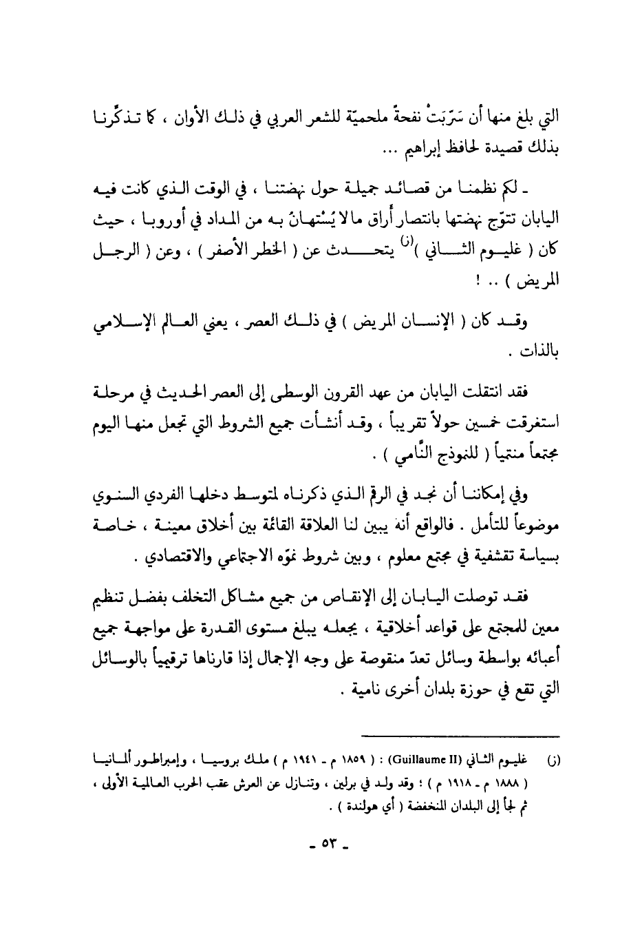 - لكم نظمنا من قصائد جميلة حول نهضتنا، في الوقت الذي كانت فيه اليابان تتوّج نهضتها بانتصار أَراق ما لا يُسْتهانُ به من المداد في أوروبا، حيث كان (غليوم الثاني) (ز) يتحدث عن (الخطر الأصفر)، وعن (الرجل المريض) .. !