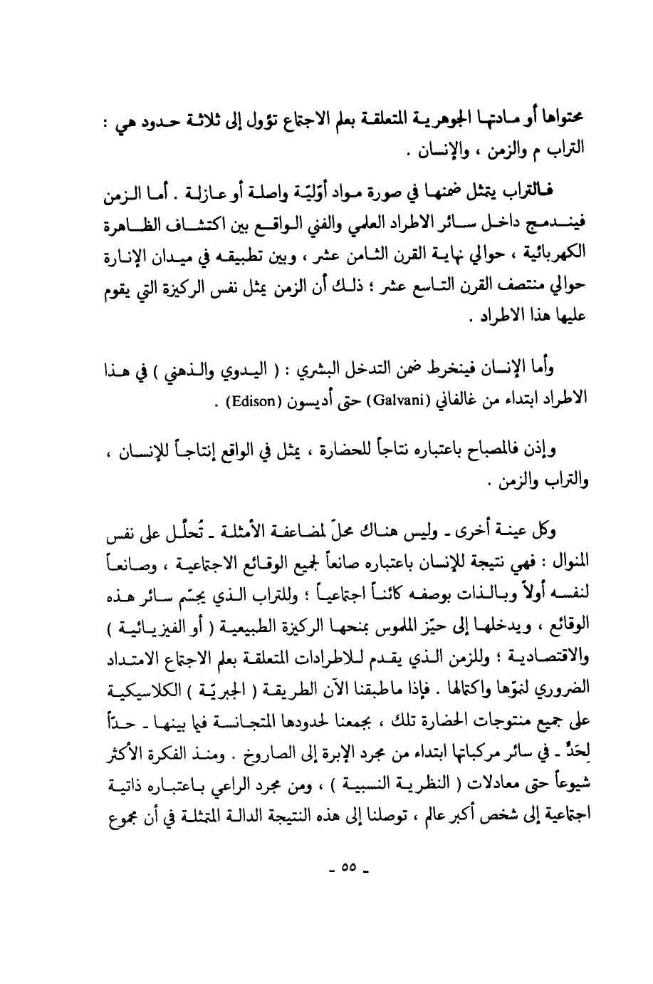 فالتراب يتمثل ضمنها في صورة مواد أوّليّة واصلة أو عازلة. أما الزمن فيندمج داخل سائر الاطراد العلمي والفني الواقع بين اكتشاف الظاهرة الكهربائية، حوالي نهاية القرن الثامن عشر، وبين تطبيقه في ميدان الإنارة حوالي منتصف القرن التاسع عشر؛ ذلك أن الزمن يمثل نفس الركيزة التي يقوم عليها هذا الاطراد.