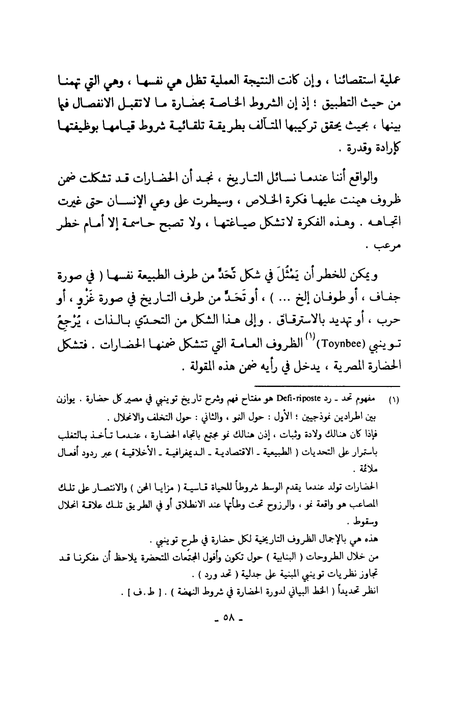 (¬1) مفهوم تحد- رد Defi-riposte هو مفتاح فهم وشرح تاريخ توينبي في مصير كل حضارة. يوازن بين اطرادين نموذجيين؛ الأول: حول النمو، والثاني: حول التخلف والانحلال.