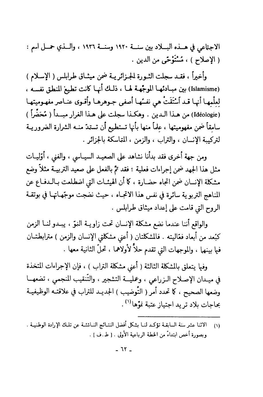 وأخيراً، فقد سجلت الثورة الجزائرية ضمن ميثاق طرابلس (الإسلام) ( Islamisme) بين مبادئها الموجِّهة لها، ذلك أنها كانت تطيع المنطق نفسه، لِعِلْمِها أنها قد اسْتَقَتْ هي نفسُها أصفى جوهرها وأقوى عناصر مفهوميتها ( Idéologie) من هذا الدين. وهكذا سجلت على هذا الغرار مبدأ (مُحَضِّراً) سامِقاً ضمن مفهوميتها، عِلماً منها بأنها تستطيع أن تستمدّ منه الشرارة الضرورية لتركيبة الإنسان، والتراب، والزمن، المتماسكة بالجزائر.
