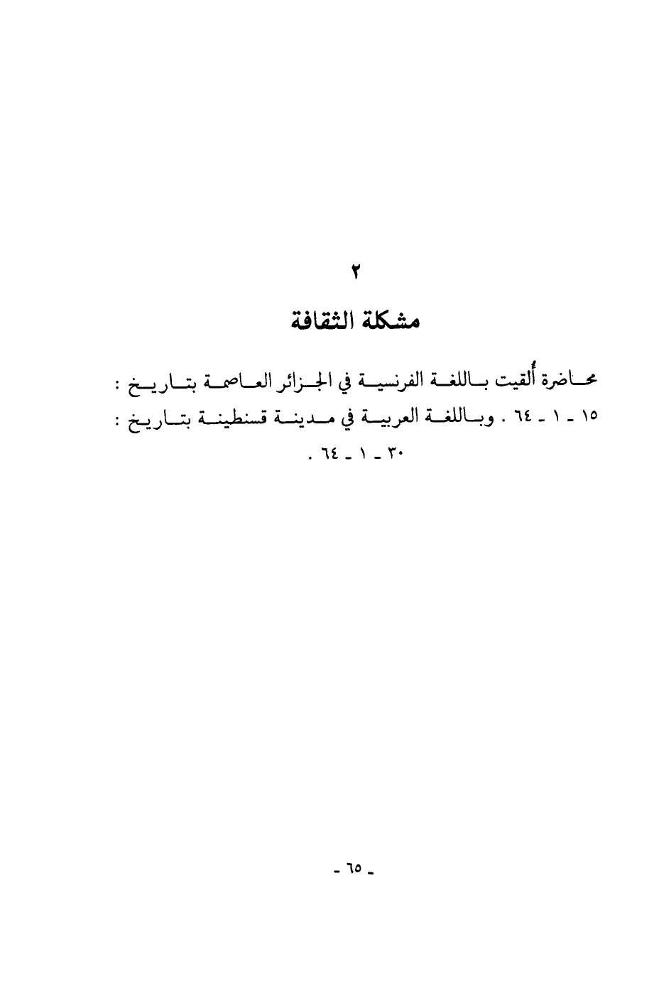 محاضرة أُلقيت باللغة الفرنسية في الجزائر العاصة بتاريخ: 15 - 1 - 64.