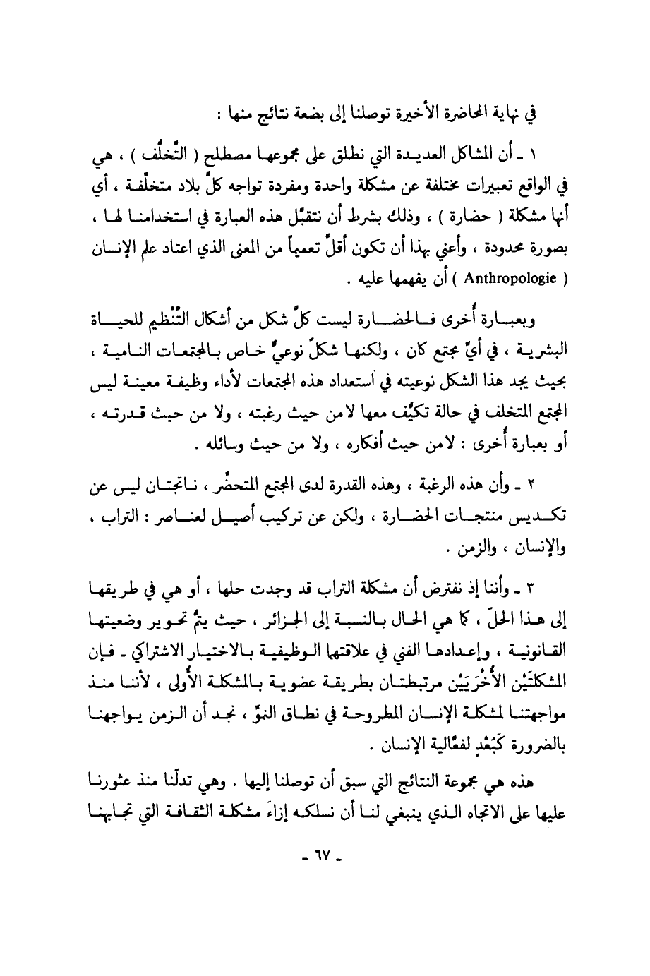 1 - أن المشاكل العديدة التي نطلق على مجموعها مصطلح (التَّخلُّف)، هي في الواقع تعبيرات مختلفة عن مشكلة واحدة ومفردة تواجه كلَّ بلاد متخلِّفة، أي أنها مشكلة (حضارة)، وذلك بشرط أن نتقبَّل هذه العبارة في استخدامنا لها، بصورة محدودة، وأعني بهذا أن تكون أقلَّ تعميماً من المعنى الذي اعتاد علم الإنسان ( Anthropologie) أن يفهمها عليه.