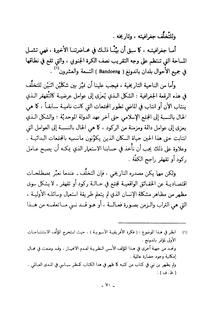 وأما من الناحية التاريخية، فيجب علينا أن نميِّز بين شكلَيْن اثنَيْن للتخلُّف في هذه الرقعة الجغرافية: الشكل الذي يُعزَى إلى عوامل عرضية كالتَّقهقر الذي ينتاب الآن أو انتاب في الماضي تطور المجتمعات التي كانت نامية سابقاً، كما هي الحال بالنسبة إلى المجتمع الإسلامي حتى آخر عهد الدولة الموحديَّة؛ والشكل الذي يعزى إلى عوامل دائمة ومزمنة من الركود، كما هي الحال بالنسبة إلى العوامل التي انتابت حتى هذا الحين حياة السكان الذين يكوِّنون ما نسميه بالمجتمعات البدائية. وعلاوة على ذلك يجب أن نأْخذ في حسابنا الاستعمار الذي يمكنه أن يصبح عامل ركود أو تقهقر راجح الكفَّة.