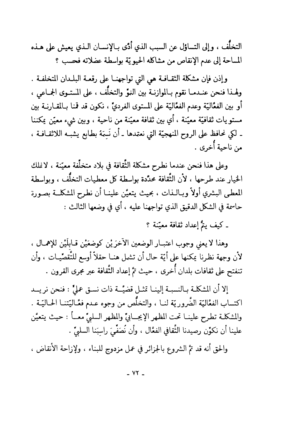 وإذن فإن مشكلة الثقافة هي التي تواجهنا على رقعة البلدان المتخلفة. ولهذا فنحن عندما نقوم بالموازنة بين النموِّ والتخلُّف، على المستوى الجماعي، أو بين الفعَّاليّة وعدم الفعَّاليّة على المستوى الفرديِّ، نكون قد قمنا بالمقارنة بين مستويات ثقافيّة معيّنة، أي بين ثقافة معيّنة من ناحية، وبين شيء معيّن يمكننا - لكي نحافظ على الروح المنهجيّة التي نعتمدها- أن نَسِمَهُ بطابع يشبه اللاثقافة، من ناحية أُخرى.