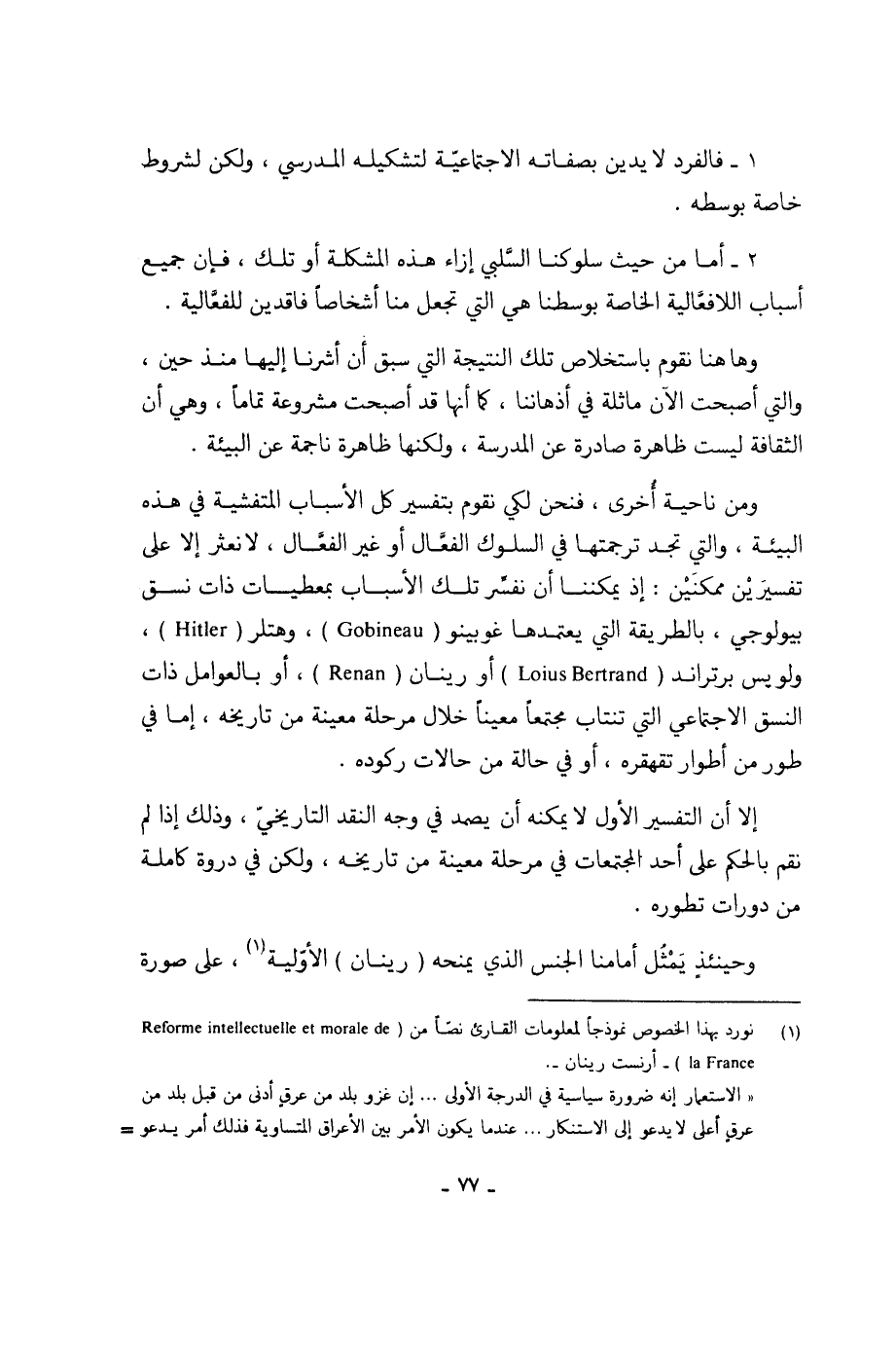 (¬1) نورد بهذا الخصوص نموذجاً لمعلومات القارئ نصّاً من ( Reforme intellectuelle et morale de la France) - أرنست رينان-.