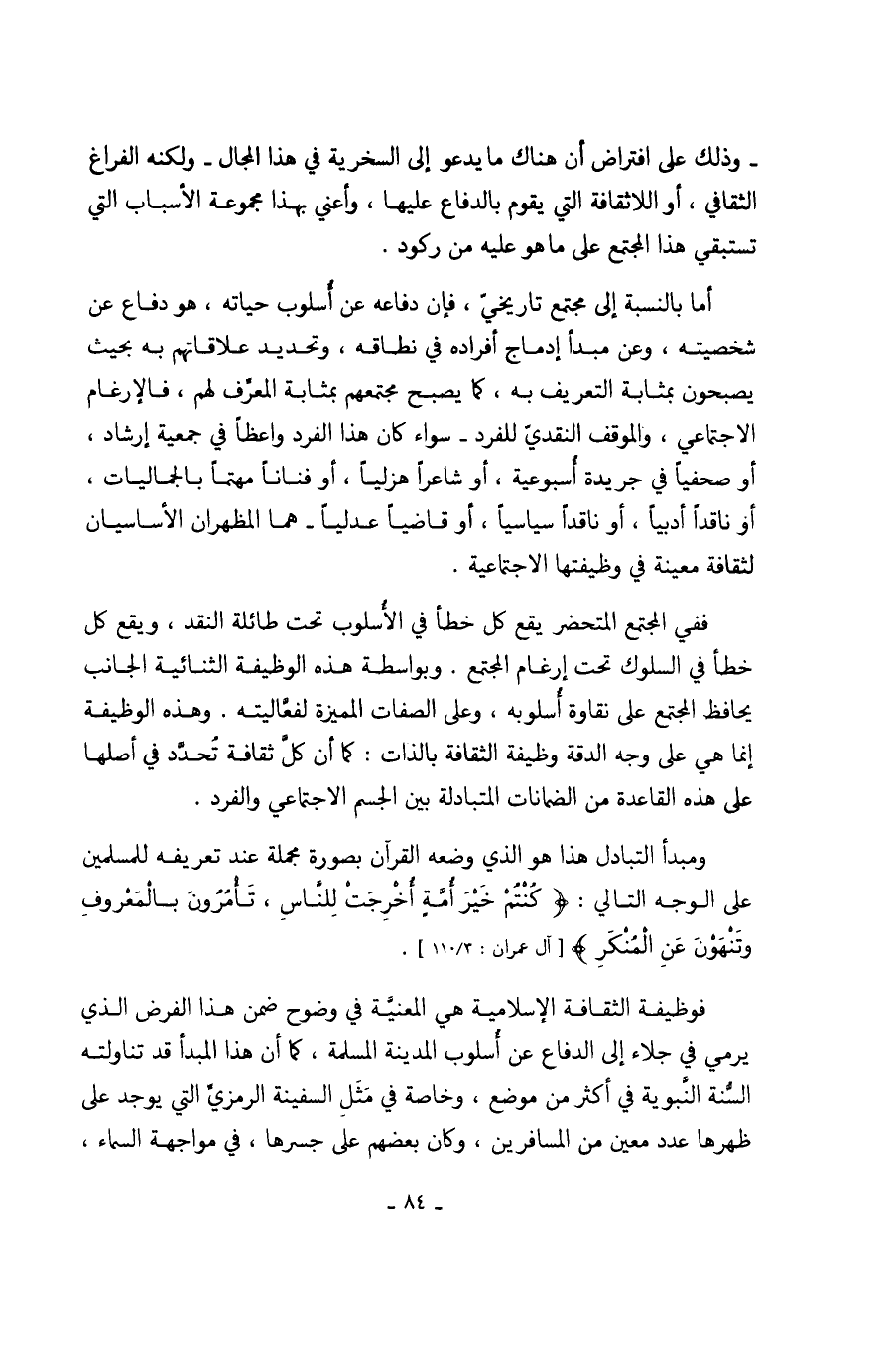 فوظيفة الثقافة الإسلامية هي المعنيَّة في وضوح ضمن هذا الفرض الذي يرمي في جلاء إلى الدفاع عن أُسلوب المدينة المسلمة، كما أن هذا المبدأ قد تناولته السُّنة النَّبوية في أكثر من موضع، وخاصة في مَثَلِ السفينة الرمزيِّ التي يوجد على ظهرها عدد معين من المسافرين، وكان بعضهم على جسرها، في مواجهة السماء،