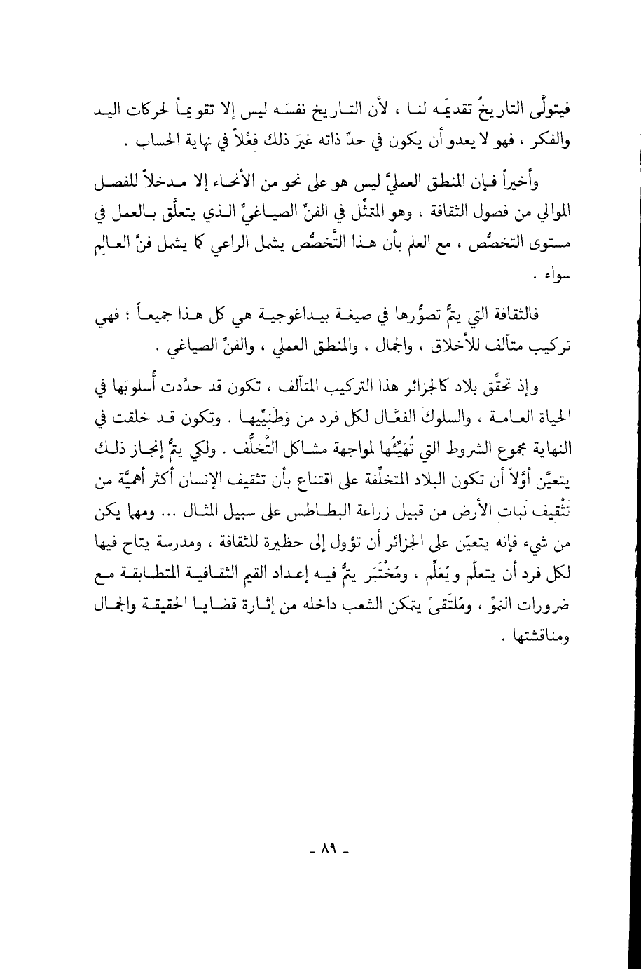 وإذ تحقِّق بلاد كالجزائر هذا التركيب المتآلف، تكون قد حدَّدت أُسلوبَها في الحياة العامة، والسلوكَ الفعَّال لكل فرد من وَطَنِيِّيها. وتكون قد خلقت في النهاية مجموع الشروط التي تُهَيِّئُها لمواجهة مشاكل التَّخلُّف. ولكي يتمُّ إنجاز ذلك يتعيَّن أوَّلاً أن تكون البلاد المتخلِّفة على اقتناع بأن تثقيف الإنسان أكثر أهميَّة من تَثْقِيف نَباتِ الأرض من قبيل زراعة البطاطس على سبيل المثال ... ومهما يكن من شيء فإنه يتعيّن على الجزائر أن تؤول إلى حظيرة للثقافة، ومدرسة يتاح فيها لكل فرد أن يتعلَّم ويُعَلِّم، ومُخْتبَر يتمُّ فيه إعداد القيم الثقافية المتطابقة مع ضرورات النموِّ، ومُلتَقىً يتمكن الشعب داخله من إثارة قضايا الحقيقة والجمال ومناقشتها.