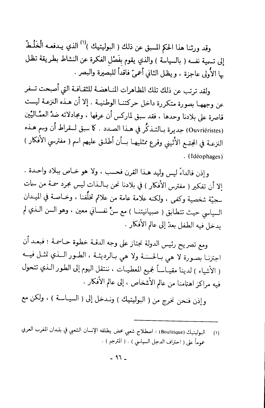 ولقد ترتب عن ذلك تلك المظاهرات المناهضة للثقافة التي أصبحت تسفر عن وجهها بصورة متكررة داخل حركتنا الوطنية. إلا أن هذه النزعة ليست قاصرة على بلادنا وحدها، فقد سبق لماركس أن عرفها، ومجادلاته ضدَّ العمَّاليِّين ( Ouvriéristes) جديرة بالتذكُّر في هذا الصدد. كما سبق لسقراط أن وسم هذه النزعة في المجتمع الأثيني وقرع ممثليها بأن أطلق عليهم اسم (مفترسي الأفكار) ( Idéophages) .