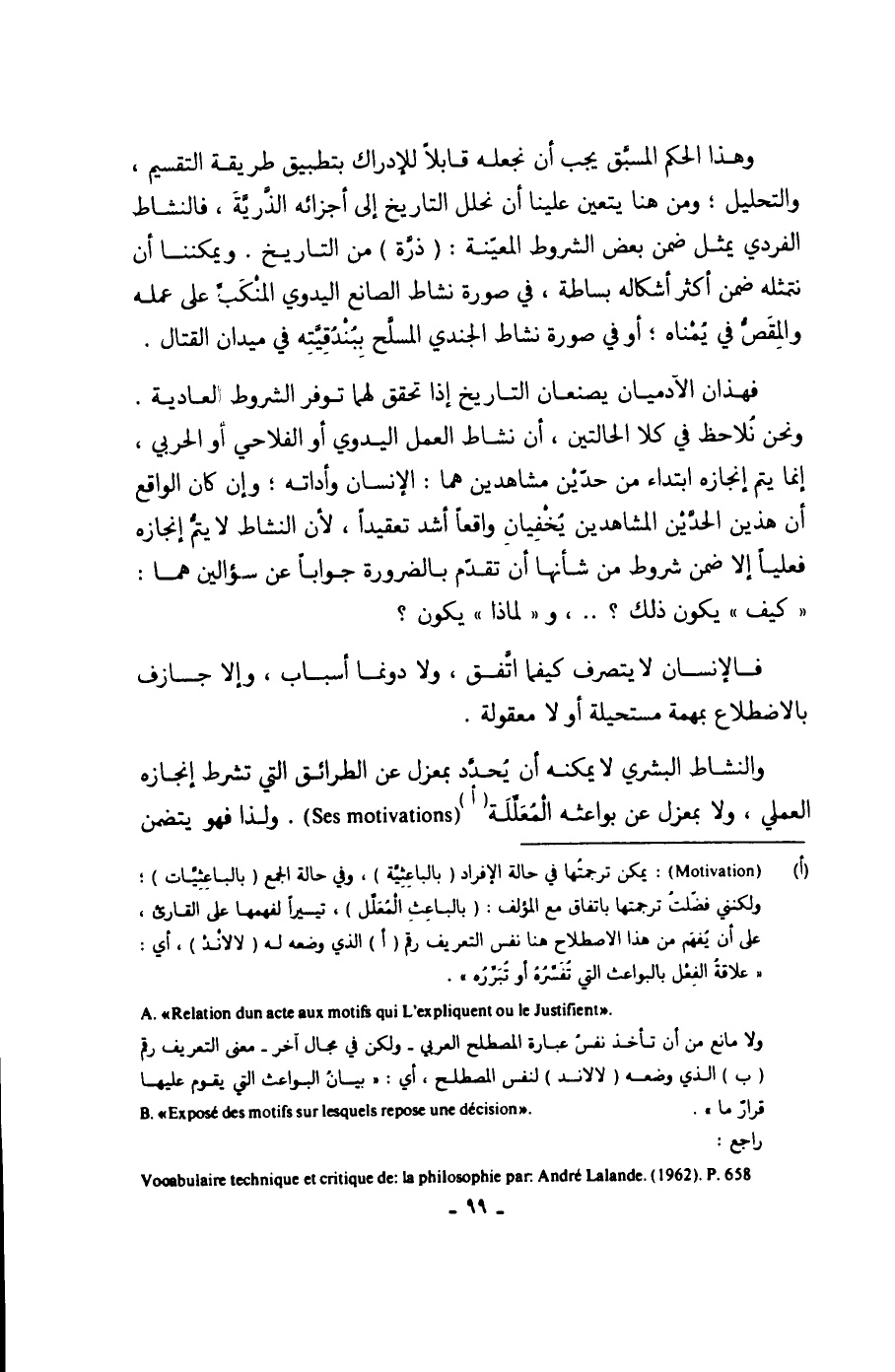 (أ) ( motivation) : يمكن ترجمتُها في حالة الإفراد (بالباعِثِيَّة)، وفي حالة الجمع (بالباعِثِيَّات)؛ ولكنني فضّلتُ ترجمتها باتفاق مع المؤلف: (بالباعِثِ الْمُعَلِّل)، تيسراً لفهمها على القارئ، على أن يُفهَم من هذا الاصطلاح هنا نفس التعريف رقم (أ) الذي وضعه له (لالانْدْ)، أي: ((علاقةُ الفِعْل بالبواعث التي تُفَسِّرُهُ أو تُبَرِّرُه)).
