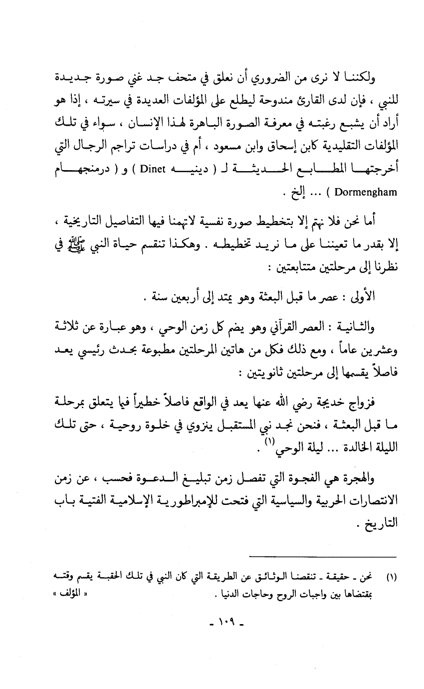 أما نحن فلا نهتم إلا بتخطيط صورة نفسية لا تهمنا فيها التفاصيل التاريخية، إلا بقدر ما تعيننا على ما نريد تخطيطه. وهكذا تنقسم حياة النبي - صلى الله عليه وسلم - في نظرنا إلى مرحلتين متتابعتين: