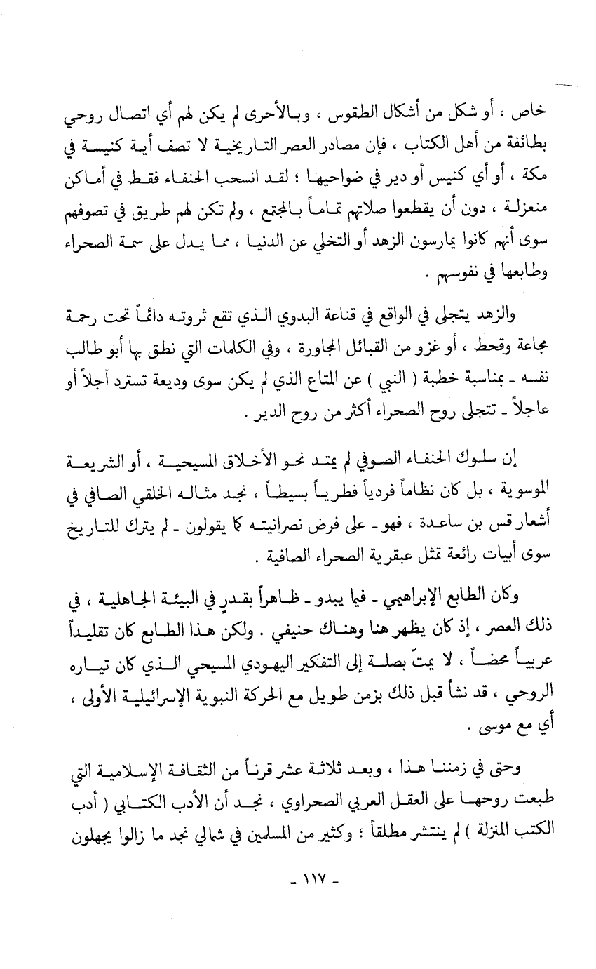خاص، أو شكل من أشكال الطقوس، وبالأحرى لم يكن لهم أي اتصال روحي بطائفة من أهل الكتاب، فإن مصادر العصر التاريخية لا تصف أية كنيسة في مكة، أو أي كنيس أو دير في ضواحيها؛ لقد انسحب الحنفاء فقط في أماكن منعزلة، دون أن يقطعوا صلاتهم تماماً بالمجتمع، ولم تكن لهم طريق في تصوفهم سوى أنهم كانوا يمارسون الزهد أو التخلي عن الدنيا، مما يدل على سمة الصحراء وطابعها في نفوسهم.