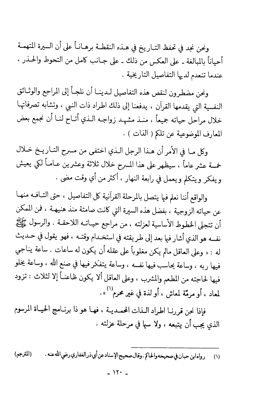 والواقع أننا نعلم فيما يتصل بالمرحلة القرآنية كل التفاصيل، حتى التافه منها عن حياته الزوجية، بفضل هذه السيرة التي كانت صامتة منذ هنيهة، فمن الممكن أن تتجلى الخطوط الأساسية لعزلته، من مراجع حياته اللاحقة. والرسول - صلى الله عليه وسلم - نفسه هو الذي أشار فيما بعد إلى طريقته في استخدام وقته، فهو يقول في حديث له: ((وعلى العاقل ما لم يكن مغلوباً على عقله أن يكون له ساعات. ساعة يناجي فيها ربه، وساعة يحاسب فيها نفسه، وساعة يتفَكر فيها في صنع الله، وساعة يخلو فيها لحاجته من المطعم والمشرب، وعلى العاقل ألا يكون ظاعناً إلا لثلاث: تزود لمعاد، أو مرمَّة لمعاش، أو لذة في غير محرم (1))).