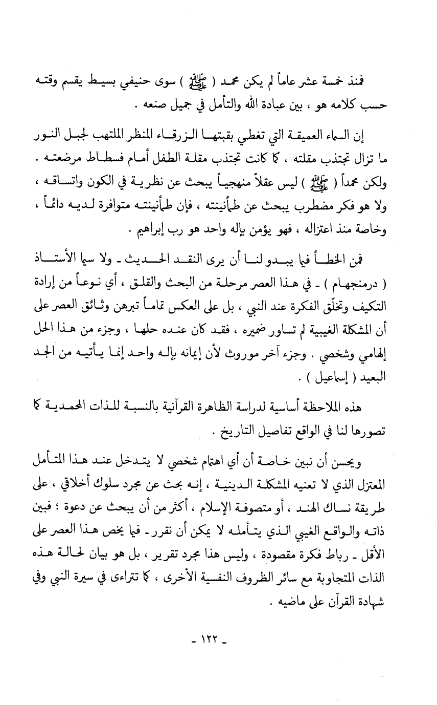 فمن الخطأ فيما يبدو لنا أن يرى النقد الحديث- ولا سيما الأستاذ (درمنجهام) - في هذا العصر مرحلة من البحث والقلق، أي نوعاً من إرادة التكيف وتخلّق الفكرة عند النبي، بل على العكس تماماً تبرهن وثائق العمر على أن المشكلة الغيبية لم تساور ضميره فقد كان عنده حلها، وجزء من هذا الحل إلهامي وشخصي. وجزء آخر موروث لأن إيمانه بإله واحد إنما يأتيه من الجد البعيد (إسماعيل).