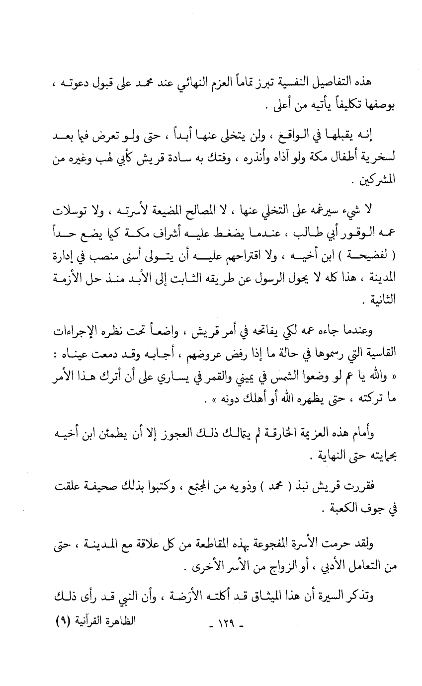 لا شيء سيرغمه على التخلي عنها، لا المصالح المضيعة لأسرته، ولا توسلات عمه الوقور أبي طالب، عندما يضغط عليه أشراف مكة كما يضع حداً (لفضيحة) ابن أخيه، ولا اقتراحهم عليه أن يتولى أسنى منصب في إدارة المدينة، هذا كله لا يحول الرسول عن طريقه الثابت إلى الأبد منذ حل الأزمة الثانية.