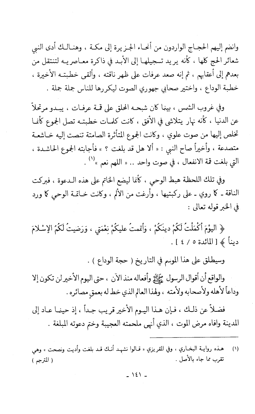 وفي غروب الشمس، بينما كان شبحه المحلق على قمة عرفات، يبدو مرتحلاً عن الدنيا، كأنه نهار يتلاشى في الأفق، كانت كلمات خطبته تصل الجموع كأنما تخلص إليها من صوت علوي، وكانت الجموع المتأثرة الصامتة تنصت إليه خاشعة متصدعة، وأخيراً صاح النبي: ((ألا هل قد بلغت؟)) فأجابته الجموع الحاشدة، التي بلغت قمة الانفعال، في صوت واحد .. ((اللهم نعم)) (1).