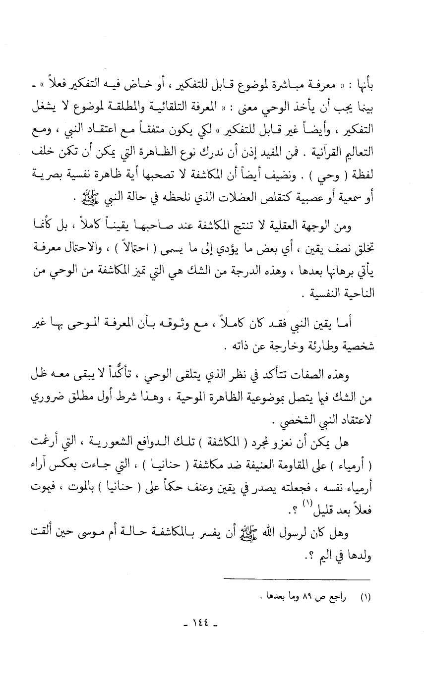 بأنها: "معرفة مباشرة لموضوع قابل للتفكير، أو خاض فيه التفكير فعلاً"- بينما يجب أن يأخذ الوحي معنى: "المعرفة التلقائية والمطلقة لموضوع لا يشغل التفكير، وأيضاً غير قابل للتفكير" لكي يكون متفقاً مع اعتقاد النبي، ومع التعاليم القرآنية. فمن المفيد إذن أن ندرك نوع الظاهرة التي يمكن أن تكمن خلف لفظة (وحي). ونضيف أيضاً أن المكاشفة لا تصحبها أية ظاهرة نفسية بصرية أوسمعية أو عصبية كتقلص العضلات الذي نلحظه في حالة النبي - صلى الله عليه وسلم -.