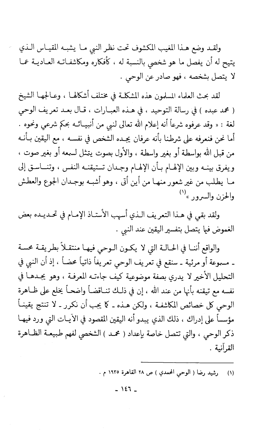 ولقد بقي في هذا التعريف الذي أسهب الأستاذ الإمام في تحديده بعض الغموض فيما يتصل بتفسير اليقين عند النبي.