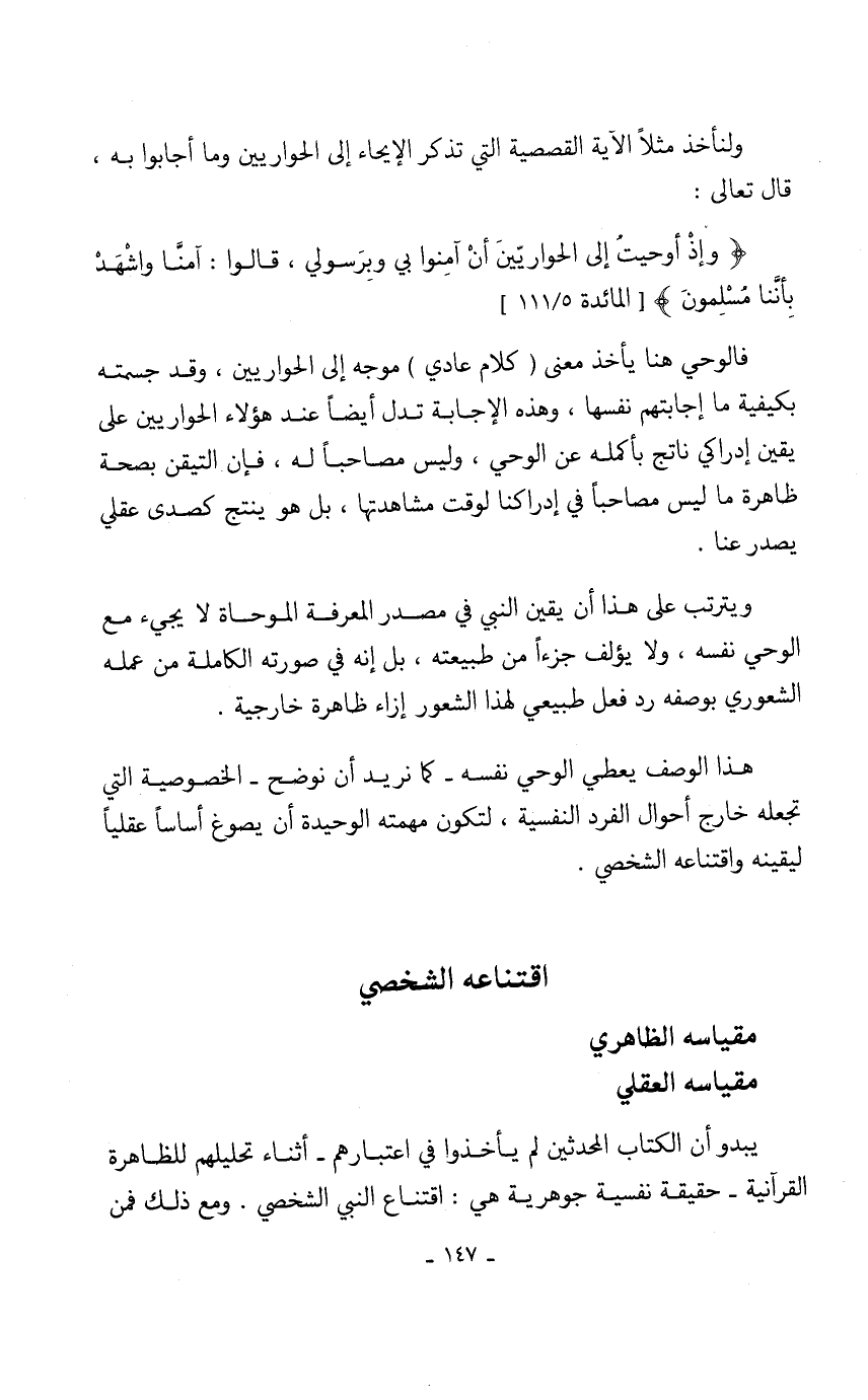 هذا الوصف يعطي الوحي نفسه- كما نريد أن نوضح- الخصوصية التي تجعله خارج أحوال الفرد النفسية، لتكون مهمته الوحيدة أن يصوغ أساساً عقلياً ليقينه واقتناعه الشخصي.