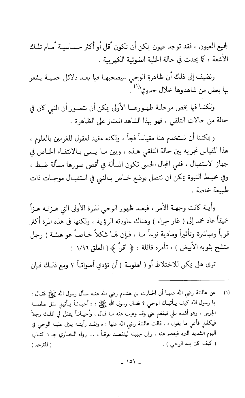 ويمكننا أن نستخدم هنا مقياساً فجاً، ولكنه مفيد لعقول المغرمين بالعلوم، هذا المقياس نجريه بين حالة التلقي هذه، وبين ما يسمى بالانتفاء الخاص في جهاز الاستقبال، ففي المجال الحسي تكون المسألة في أقصى صورها مسألة ضبط، وفي محيط النبوة يمكن أن نتصل بوضع خاص بالنبي في استقبال موجات ذات طبيعة خاصة.