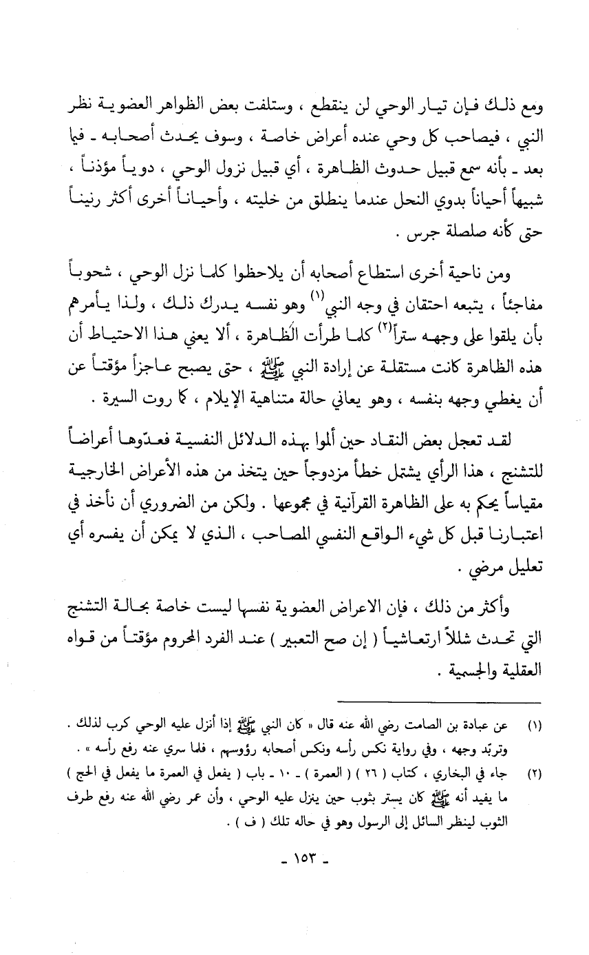 ومن ناحية أخرى استطاع أصحابه أن يلاحظوا كما نزل الوحي، شحوباً مفاجئاً، يتبعه احتقان في وجه النبي (1) وهو نفسه يدرك ذلك، ولذا يأمرهم بأن يلقوا على وجهه ستراً (2) كما طرأت الظاهرة، ألا يعني هذا الاحتياط أن هذه الظاهرة كانت مستقلة عن إرادة النبي - صلى الله عليه وسلم -، حق يصبح عاجزاً مؤقتاً عن أن يغطي وجهه بنفسه، وهو يعاني حالة متناهية الإيلام، كما روت السيرة.