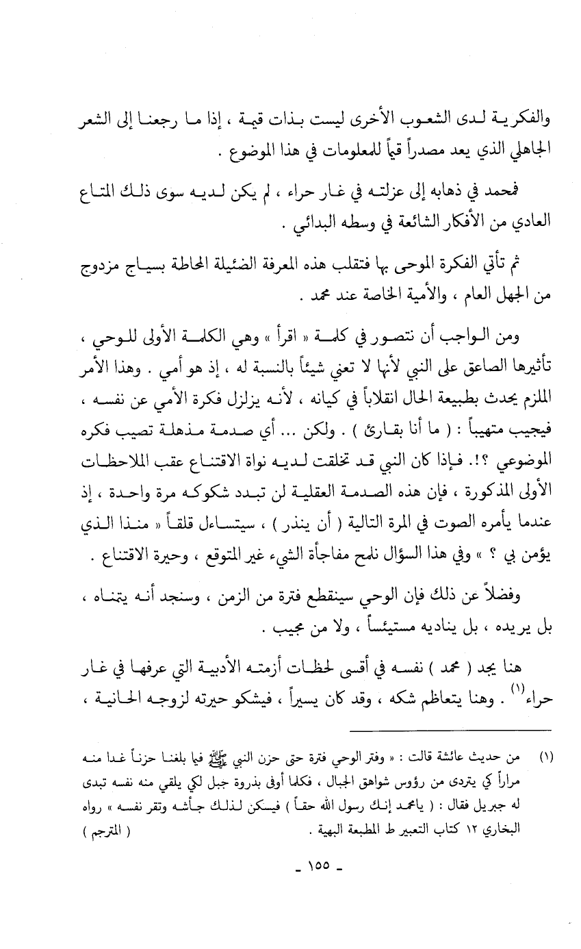 (1) من حديث عائشة قالت: "وفتر الوحي فترة حتى حزن النبي - صلى الله عليه وسلم - فيما بلغنا حزناً غدا منه مراراً كي يتردى من رؤوس شواهق الجبال، فكلما أوفى بذروة جبل لكي يلقي منه نفسه تبدى له جبريل فقال: (يا محمد إنك رسول الله حقاً) فيسكن لذلك جأشه وتقر نفسه" رواه البخاري 12 كتاب التعبير ط المطبعة البهية. (المترجم)