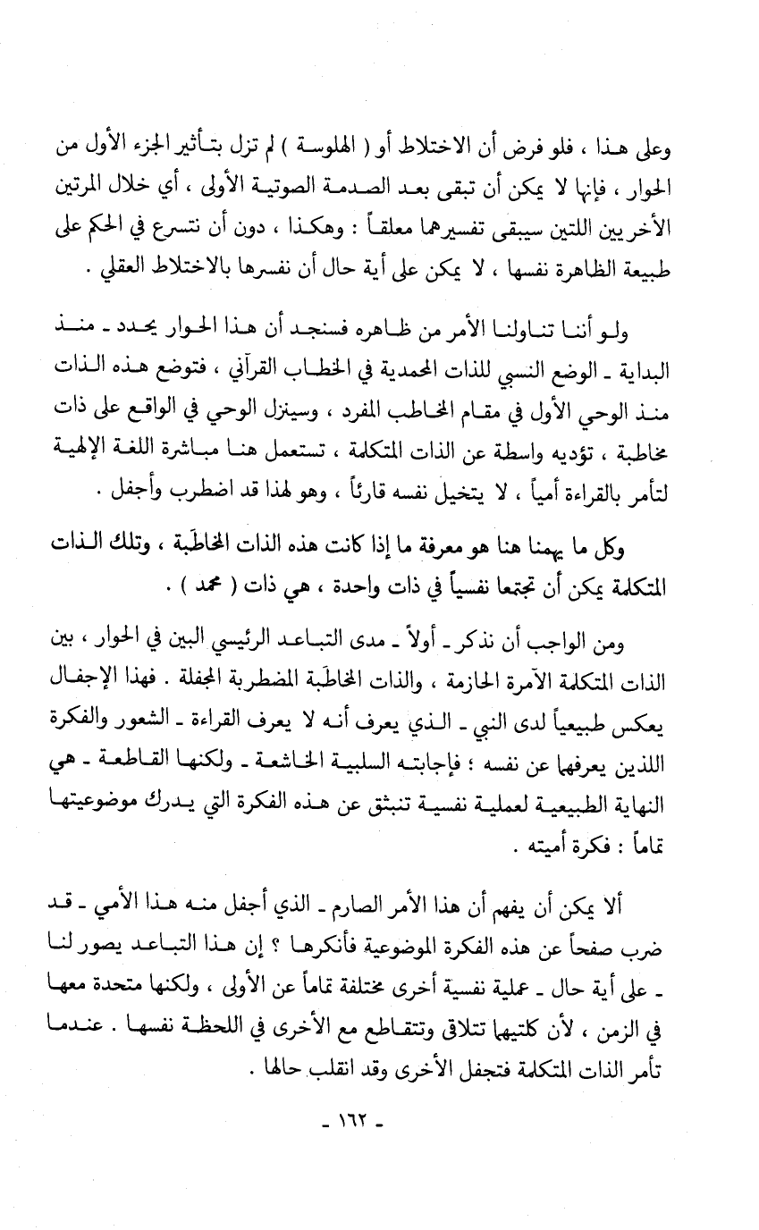 ولو أننا تناولنا الأمر من ظاهره فسنجد أن هذا الحوار يحدد- منذ البداية- الوضع النسبي للذات المحمدية في الخطاب القرآني، فتوضع هذه الذات منذ الوحي الأول في مقام المخاطب المفرد، وسينزل الوحي في الواقع على ذات مخاطبة، تؤديه واسطة عن الذات المتكلمة، تستعمل هنا مباشرة اللغة الإلهية لتأمر بالقراءة أمياً، لا يتخيل نفسه قارئاً، وهو لهذا قد اضطرب وأجفل.