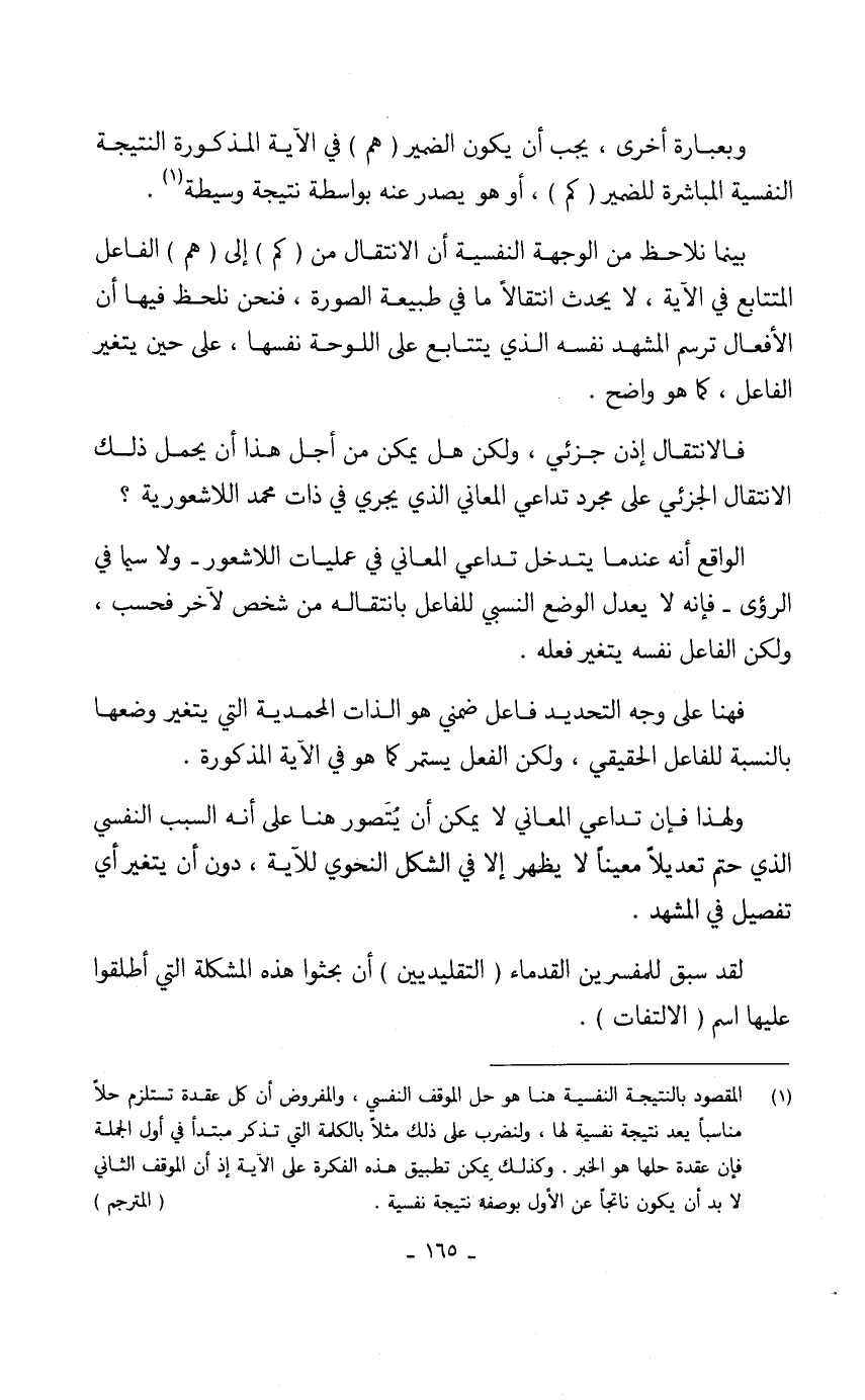 (1) المقصود بالنتيجة النفسية هنا هو حل الموقف النفسي، والمفروض أن كل عقدة تستلزم حلاً مناسباً يعد نتيجة نفسية لها، ولنضرب على ذلك مثلاً بالكلمة التي تذكر مبتدأ في أول الجملة فإن عقدة حلها هو الخبر. وكذلك يمكن تطبيق هذه الفكرة على الآية إذ أن الموقف الثاني لا بد أن يكون ناتجاً عن الأول بوصفه نتيجة نفسية. (المترجم)
