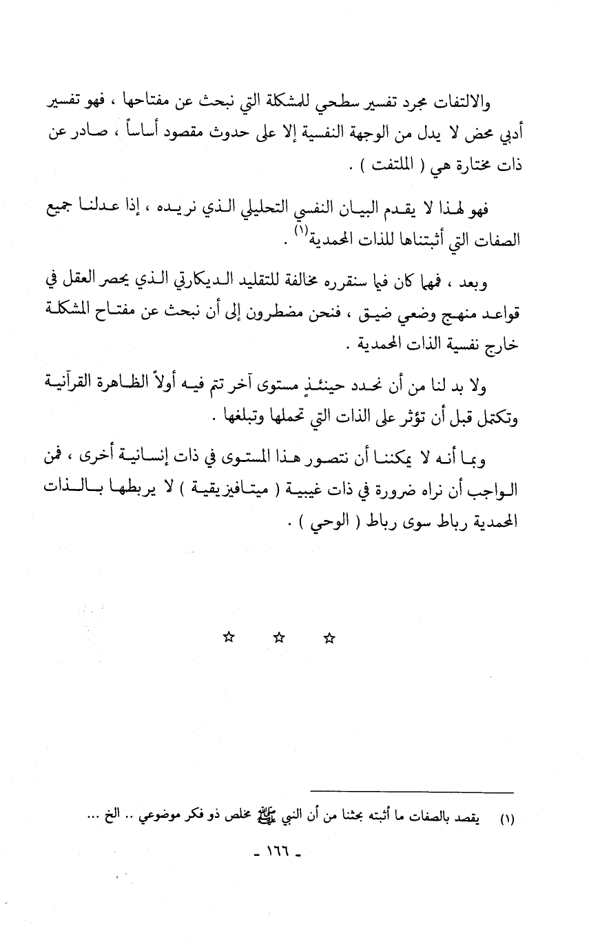 وبعد، فمهما كان فيما سنقرره مخالفة للتقليد الديكارتي الذي يحصر العقل في قواعد منهج وضعي ضيق، فنحن مضطرون إلى أن نبحث عن مفتاح المشكلة خارج نفسية الذات المحمدية.