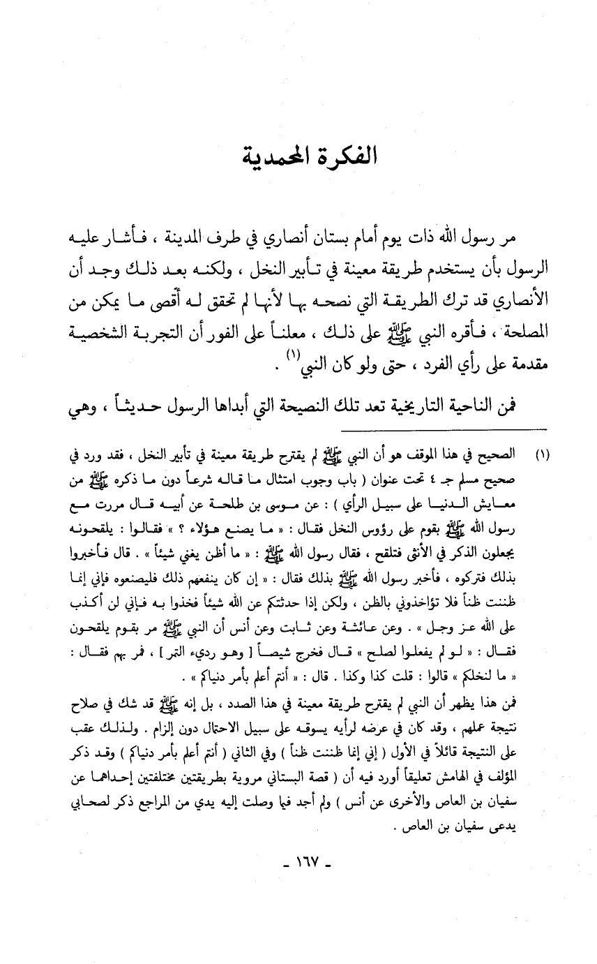 فمن هذا يظهر أن النبي لم يقترح طريقة معينة في هذا الصدد، بل إنه - صلى الله عليه وسلم - قد شك في صلاح نتيجة عملهم، وقد كان في عرضه لرأيه يسوقه على سبيل الاحتمال دون إلزام. ولذلك عقب على النتيجة قائلاً في الأول (إني إنما ظننت ظناً) وفي الثاني (أنتم أعلم بأمر دنياكم) وقد ذكر المؤلف في الهامش تعليقاً أورد فيه أن (قصة البستاني مروية بطريقتين مختلفتين إحداهما عن سفيان بن العاص والأخرى عن أنس) ولم أجد فيما وصلت إليه يدي من المراجع ذكر لصحابي يدعى سفيان بن العاص.