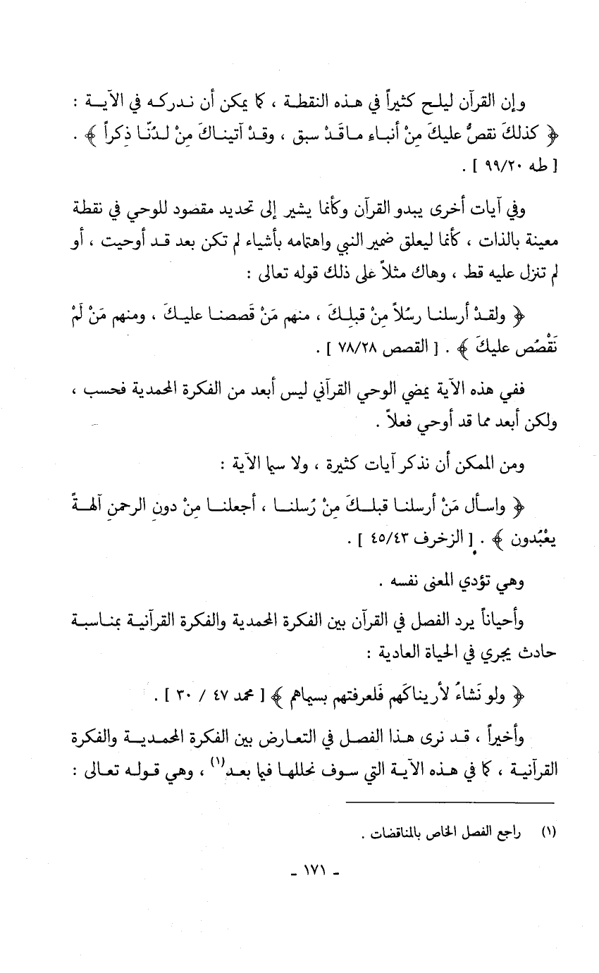 وأخيراً، قد نرى هذا الفصل في التعارض بين الفكرة المحمدية والفكرة القرآنية، كما في هذه الآية التي سوف نحللها فيما بعد (1)، وهي قوله تعالى: