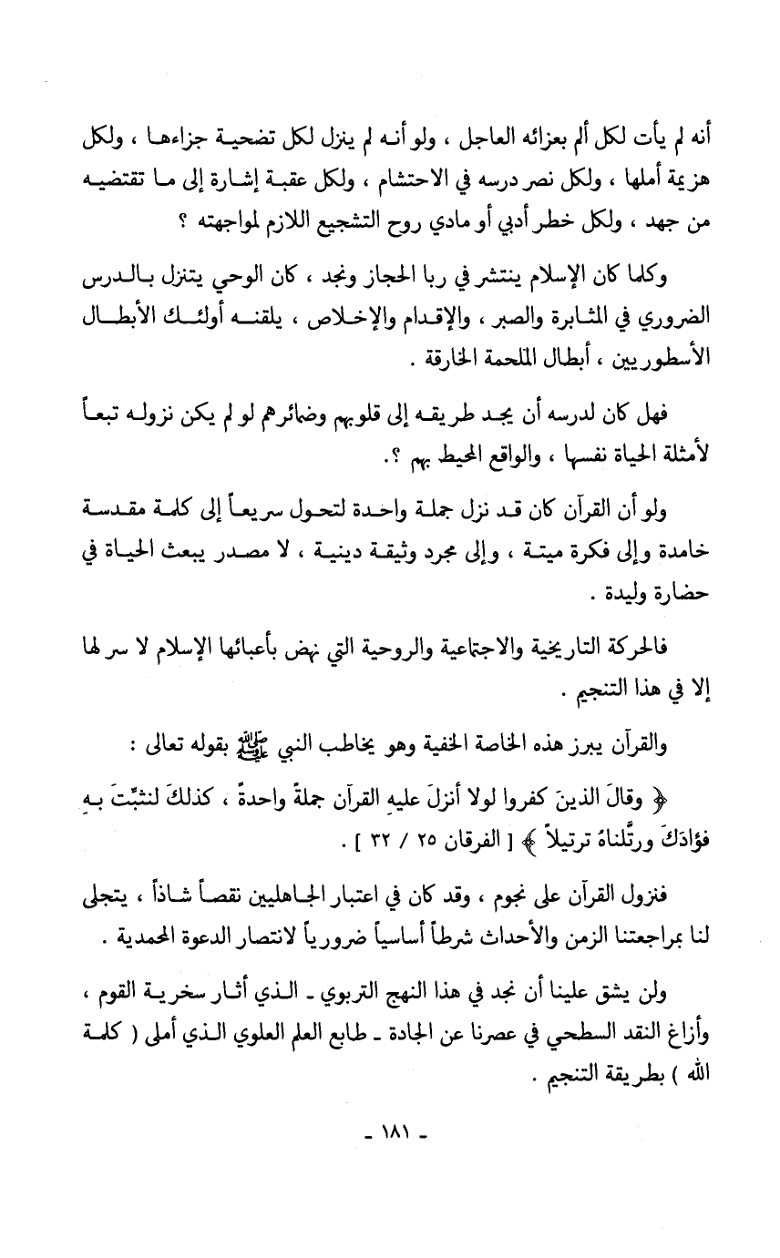 ولو أن القرآن كان قد نزل جملة واحدة لتحول سريعاً إلى كلمة مقدسة خامدة وإلى فكرة ميتة، وإلى مجرد وثيقة دينية، لا مصدر يبعث الحياة في حضارة وليدة.