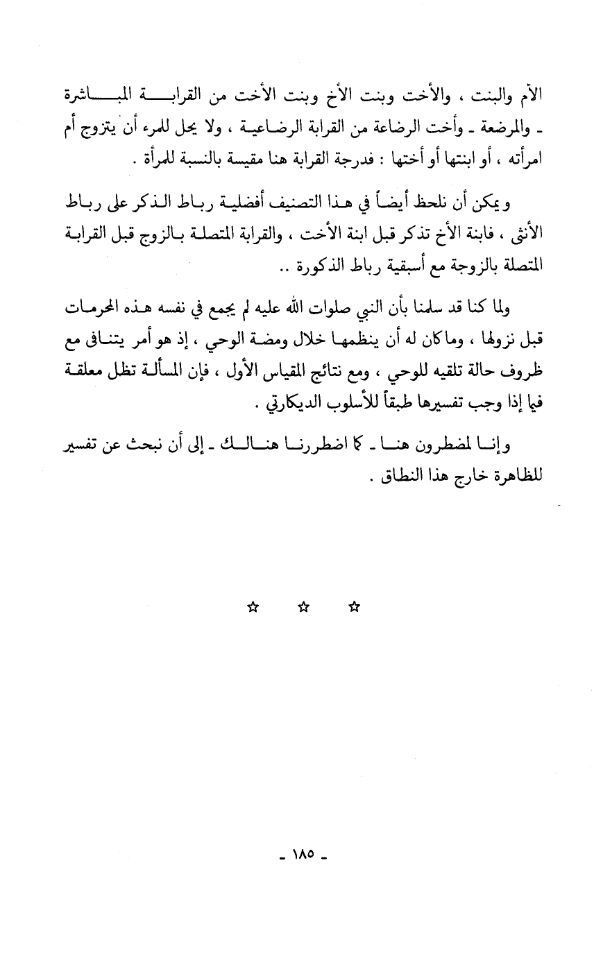 ويمكن أن نلحظ أيضاً في هذا التصنيف أفضلية رباط الذكر على رباط الأنثى، فابنة الأخ تذكر قبل ابنة الأخت، والقرابة المتصلة بالزوج قبل القرابة المتصلة بالزوجة مع أسبقية رباط الذكورة ..