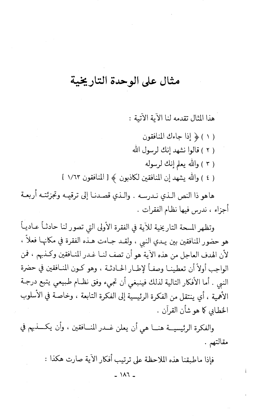 وتظهر المسحة التاريخية للآية في الفقرة الأولى التي تصور لنا حادثاً عادياً هو حضور المنافقين بين يدي النبي، ولقد جاءت هذه الفقرة في مكانها فعلاً، لأن الهدف العاجل من هذه الآية هو أن تصف لنا غدر المنافقين وكذبهم، فمن الواجب أولاً أن تعطينا وصفاً لإطار الحادثة، وهو كون المنافقين في حضرة النبي. أما الأفكار التالية لذلك فينبغي أن تجيء وفق نظام طبيعي يتبع درجة الأهمية، أي ينتقل من الفكرة الرئيسية إلى الفكرة التابعة، وخاصة في الأسلوب الخطابي كما هو شأن القرآن.
